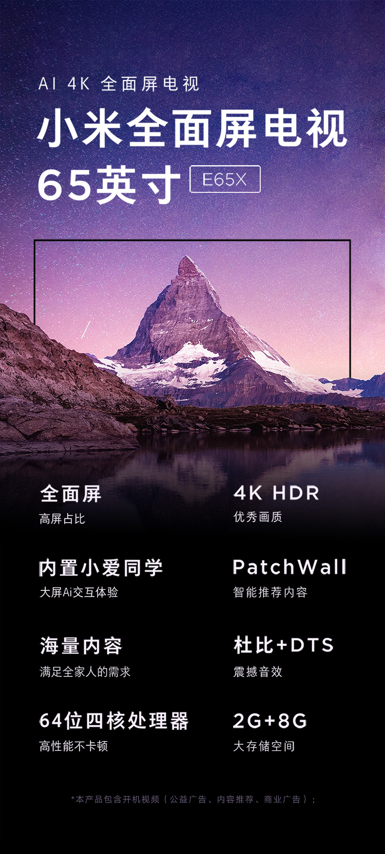 商品名稱:小米(MI)電視E65X 65英寸 全面屏 4K超高清HDR 藍(lán)牙遙控內(nèi)置小愛 2 8GB AI人工智能液晶網(wǎng)絡(luò)平板電視 L65M5-EA