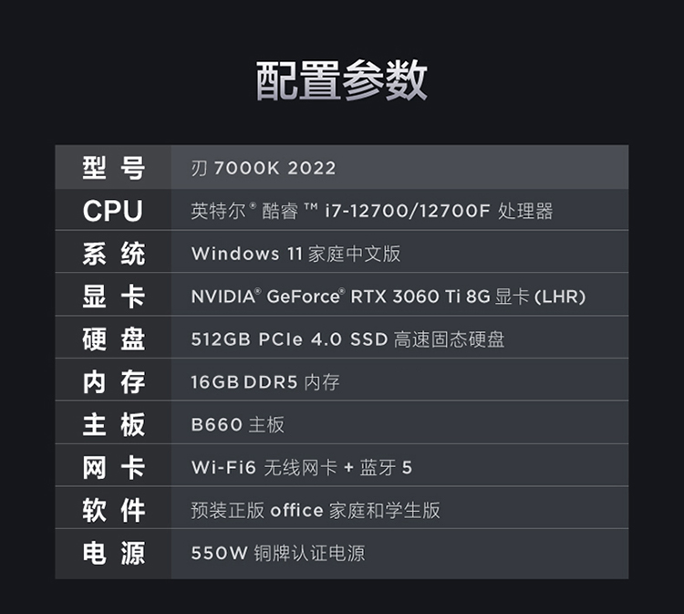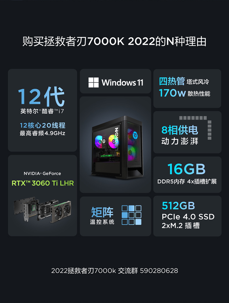 商品名稱(chēng):?聯(lián)想(Lenovo)拯救者刃7000K 2022游戲電腦主機(jī)(12代i7-12700F RTX3060Ti LHR顯卡 16G DDR5 512G SSD)