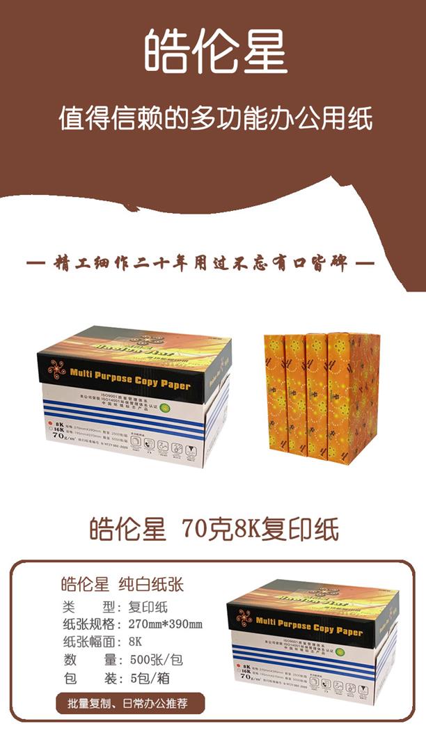 商品名稱:皓倫星 70克8K 復印紙 5包/箱 500張/包(單價 元/箱)廠家直銷