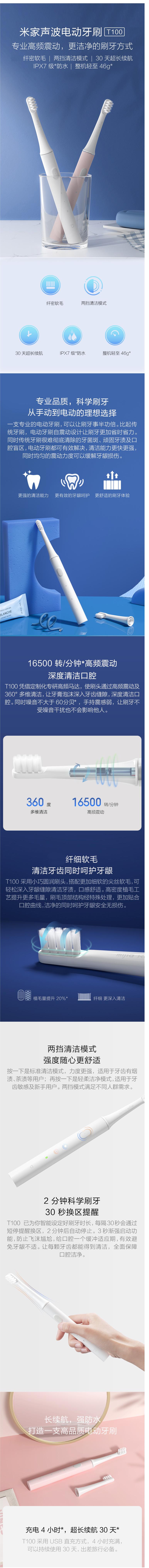 商品名稱:小米 T100 電動(dòng)牙刷 米家 成人聲波震動(dòng) 纖密軟毛 30天超長(zhǎng)續(xù)航 IPX7防水 白色/藍(lán)色/粉色