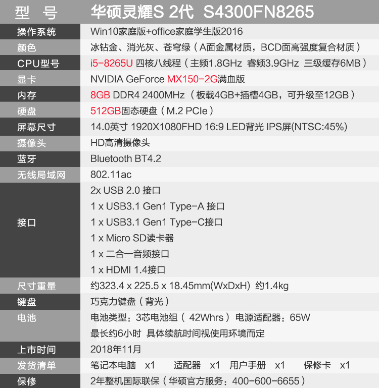 自營自營 華碩(ASUS)靈耀S 2代 14英寸三面微邊超輕薄筆記本電腦第八代英特爾?酷睿?i5(i5-8265U 8GB 512GB MX150-2G獨顯)冰鉆金(S4300FN)