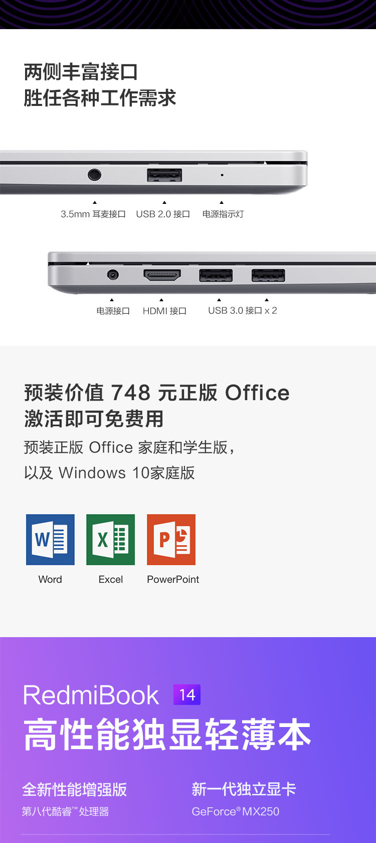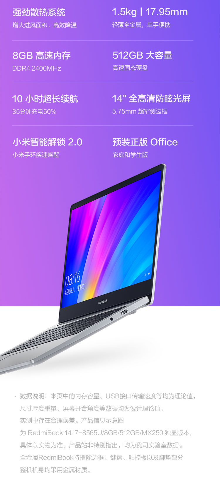商品名稱(chēng):RedmiBook 14英寸全金屬超輕薄(第八代英特爾酷睿i5-8265U 8G 512G SSD MX250 2G獨(dú)顯 Office 支持手環(huán)疾速解鎖 Win10)游戲 銀 筆記本 小米 紅米