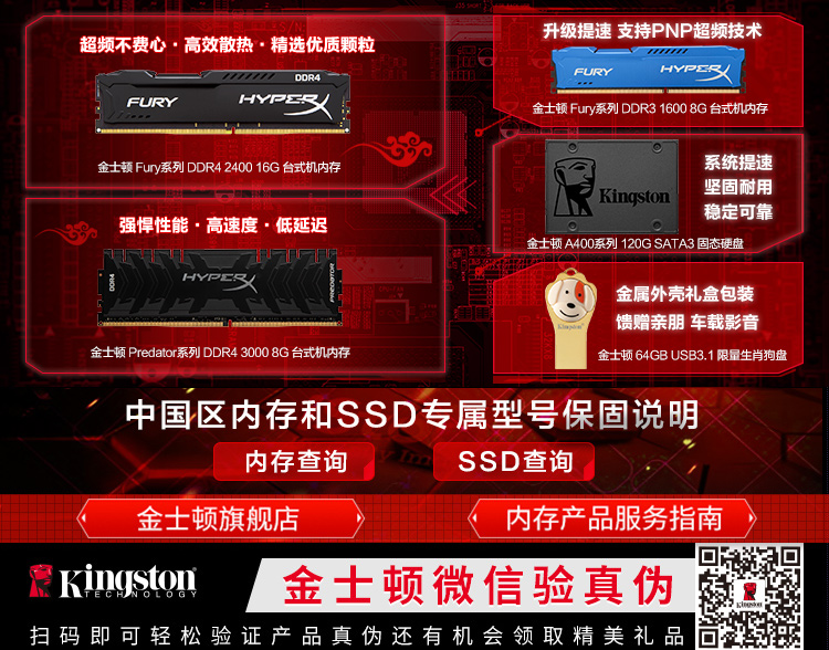 自營(yíng)金士頓(Kingston)駭客神條 Fury系列 DDR4 2400 16G 臺(tái)式機(jī)內(nèi)存