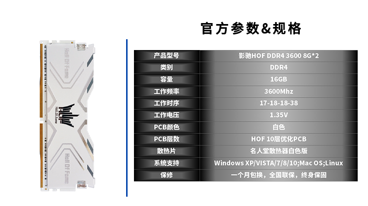 商品名稱(chēng):影馳 名人堂DDR4 3600 8G*2 16G 臺(tái)式機(jī)電腦內(nèi)存條 白色 DDR4 3600